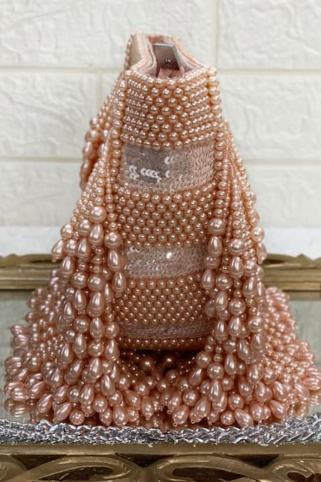 Pink rectangle shaped bag with pearl embedded and sequin embroidery