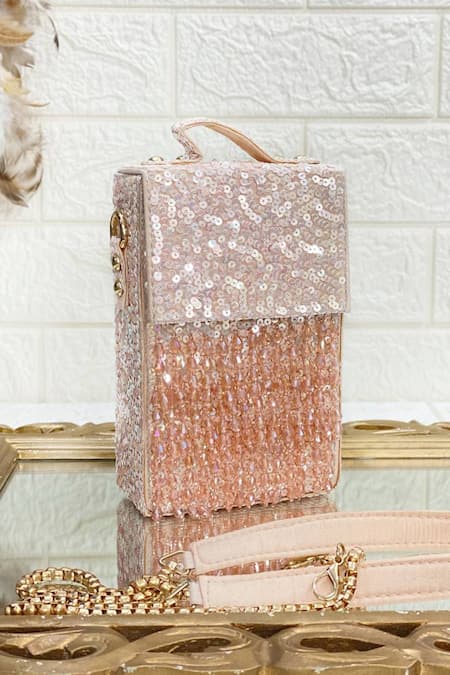 Gold pink clutch bag featuring hand work sequin embellishments and tassel details