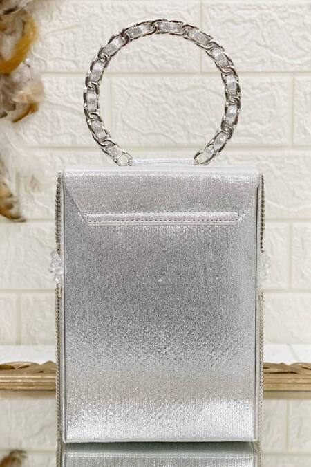 Silver rectangle shaped bag with sequin embellishment & attached fringes. Comes with round handle.