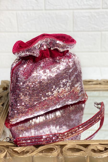 Maroon potli bag crafted from raw silk featuring all-over tonal cut dana and sequin embellishments