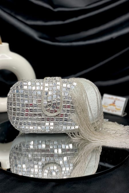 Buy_Kainiche By Mehak_Silver Cutdana Sequin Capsule Bag _at_Aza_Fashions