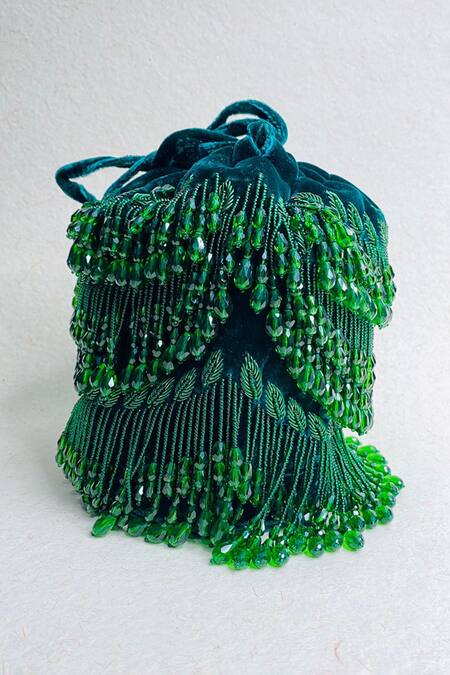 Green velvet potli featuring pearl drop and cutdana embroidered motifs
