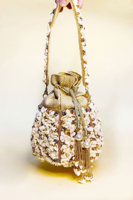 Gold jute potli bag featuring mother of pearl stones and gold sequin embellishments