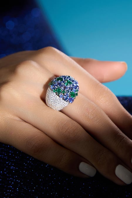 Azure domed cluster ring featuring tanzanite and Zambian emerald stones embellished with full cut diamonds