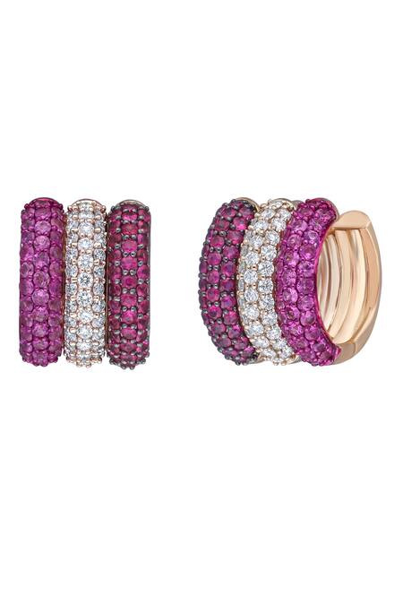 Pink Diamonds, Stones, 18kt Yellow Gold Trio Sapphire And Ruby Mini Hoops
