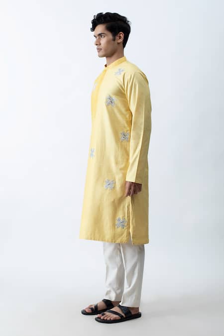 Yellow ombre kurta with applique motifs and side slits. Comes ivory straight pants.