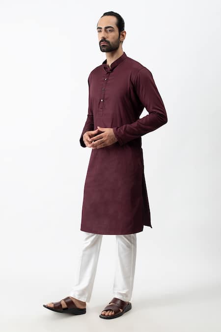 Wine straight kurta with pintuck detail on the cuffs and pleated collar. Comes with ivory straight pants.