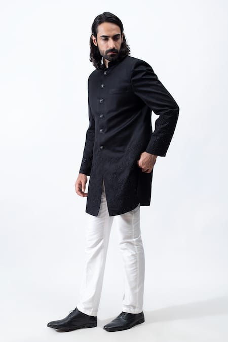 Black bandhgala with floral embroidery and welt pocket. Comes with ivory trousers.
