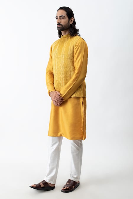 Mustard bundi with thread embroidered motifs and band collar. Comes with straight kurta and ivory straight pants.