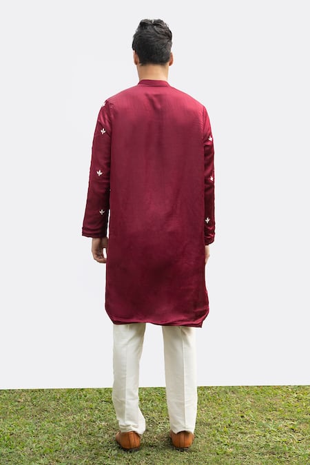 Maroon kurta featuring white embroidered motifs and a front buttoned placket. Paired with ivory cotton silk pyjama pant and a dupatta.