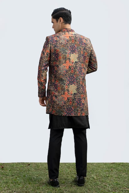 Black bam silk kurta featuring pintucks on the collar. Paired with a floral printed front-open jacket and cotton silk pyjama pant.