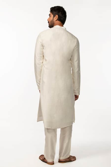 Ivory kurta featuring full sleeves, mandarin collar, and mirror embroidery on the sleeve hem. Paired with a cotton silk pant pyjama.