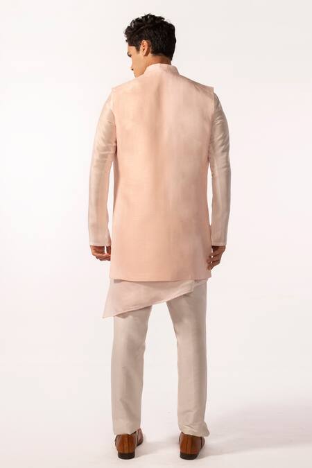 Pink achkan featuring thread embroidery in a wave pattern and a mandarin collar
