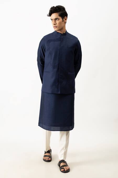Midnight blue bundi with placement thread and cutdana embroidery. Comes with kurta and ivory straight pants.