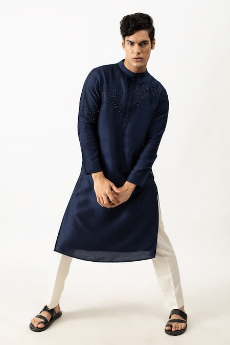Midnight blue kurta with placement thread and cutdana embroidery. Comes with ivory straight pants.