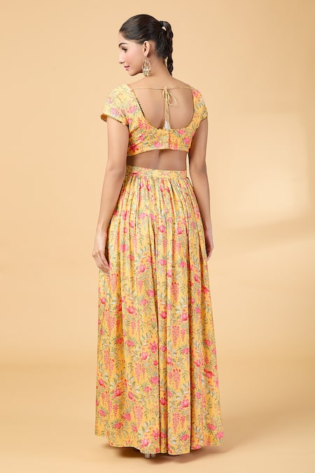 Yellow lehenga set featuring floral print with aari and zardosi embroidery. Includes a coordinating scallop hem dupatta and a cap sleeve blouse.