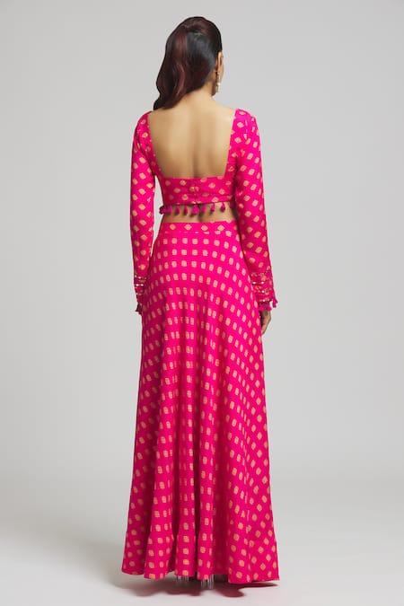 Pink Georgette, Cotton, Silk Tassels Square Bloom Motif Print Lehenga Blouse Set