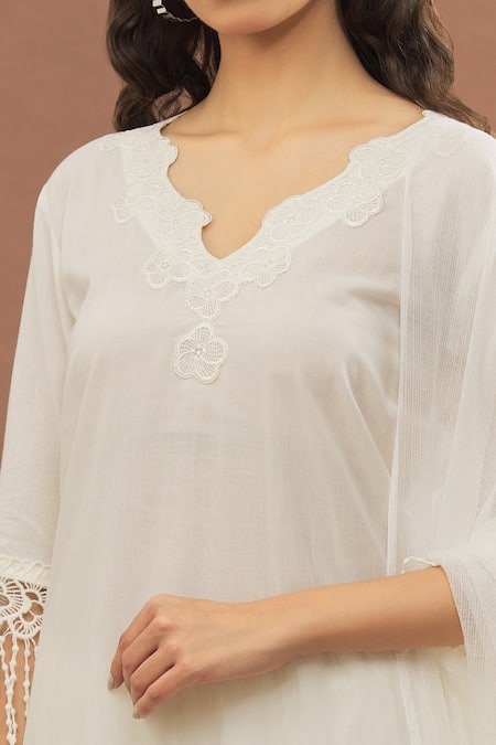 White kurta featuring cut-out neckline and tasselled lace borders. Paired with matching pant and dupatta, both adorned with lace details.