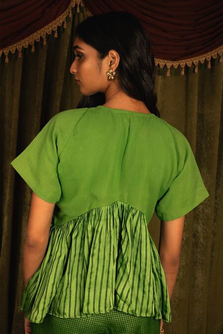 Green top with floral embroidered motifs & pleated detailing. Paired with pant in checkered print.