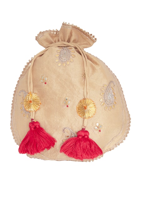 Beige potli bag featuring gota embroidery with floral and paisley designs