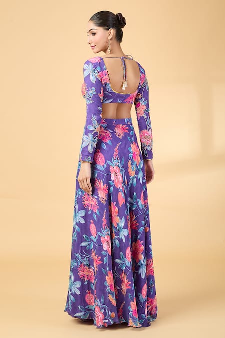 Purple floral print blouse featuring a scoop neckline and full sleeves with aari and zardosi embroidery. Paired with a coordinating lehenga and scallop hem dupatta.