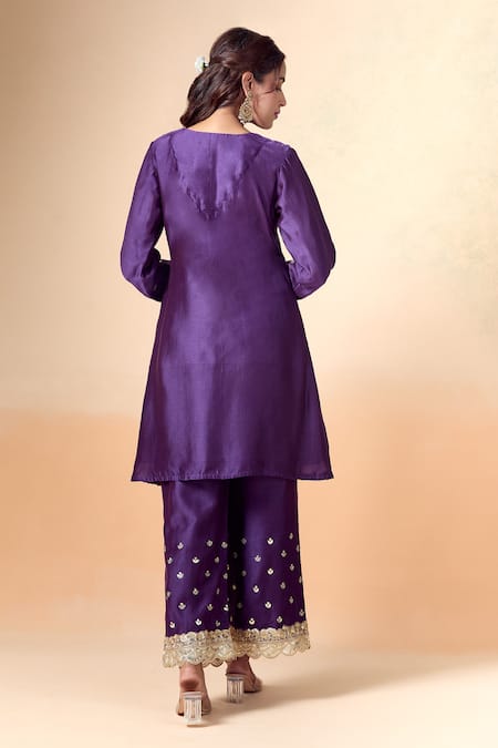 Purple straight kurta featuring floral, sequin, and gota patti embroidered placket. Paired with embroidered pant and matching dupatta.