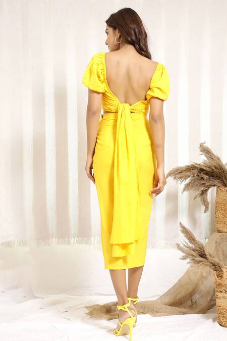 Mango yellow pleated wrap style crop top featuring a sweetheart neckline and lace trim on the hems. Paired with a draped skirt that has a side slit for added flair.