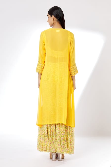 Yellow shrug with embroidery on the sleeve hems. Comes with floral embroidered blouse and sharara.