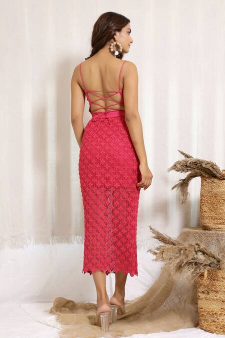 Pink crop top featuring pleats and midriff flossing. Accompanied by a crochet pencil skirt with an inner short skirt.