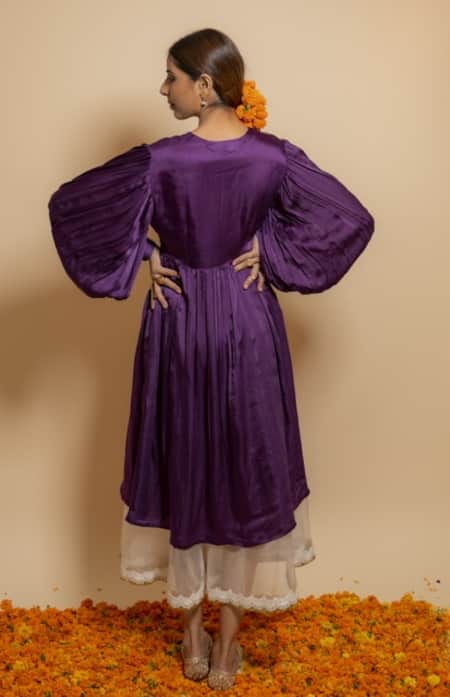 Purple embroidered kurta featuring a V neck, full sleeves, and gathered bodice. Paired with a silk organza skirt with a lace hemline.