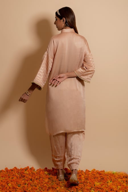 Buy_Kalakari by Akanksha_Beige Modal, Satin Gota Patti Shawl Neck Ribbon Embroidered Kurta Set _at_Aza_Fashions