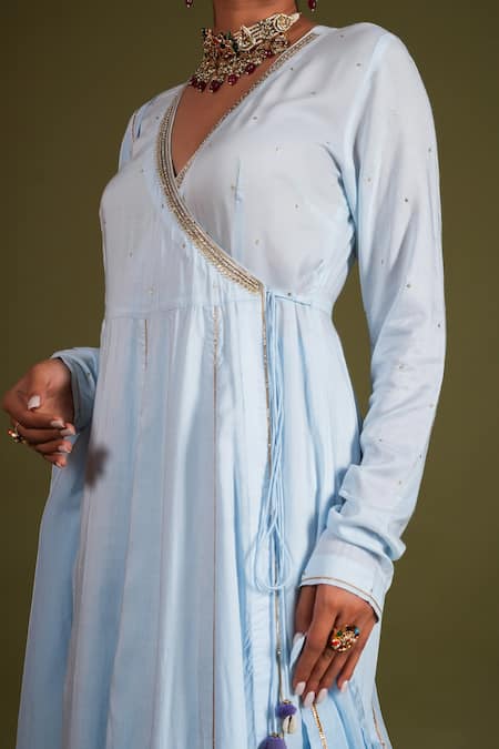 Powder blue anarkali with long sleeves featuring V neckline and intricate embroidery. Paired with a churidar and a hand embroidered dupatta.