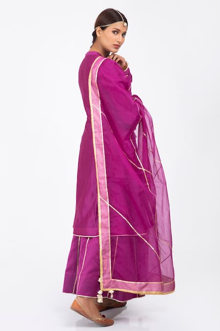 Mulberry purple anarkali with gota patti trims and fringe detail on the yoke. Comes with lehenga and organza dupatta.
