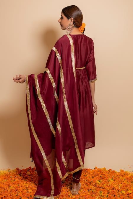 Maroon silk chanderi gathered kurta featuring hand embroidery on the bodice. Paired with straight cut pants and a gotapatti embroidered dupatta.