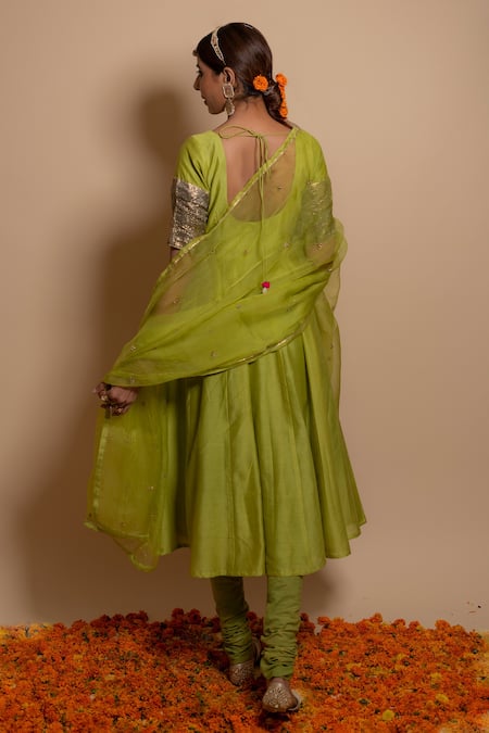 Pistachio green silk chanderi anarkali kurta featuring gota patch embroidery. Paired with churidar and a hand embroidered organza dupatta.