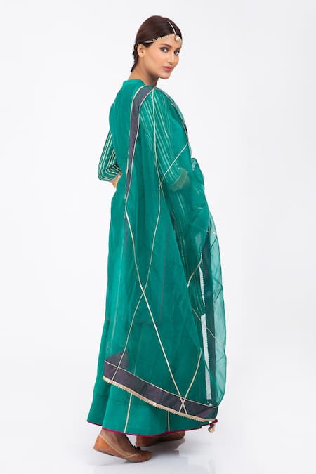 Teal blue kurta with gota patti trims and fringe detail at the neckline. Comes with lehenga and organza dupatta.
