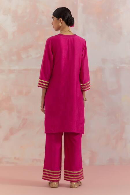 Fuchsia Raw Silk Gota Work V Neck Kali Embellished Kurta Set