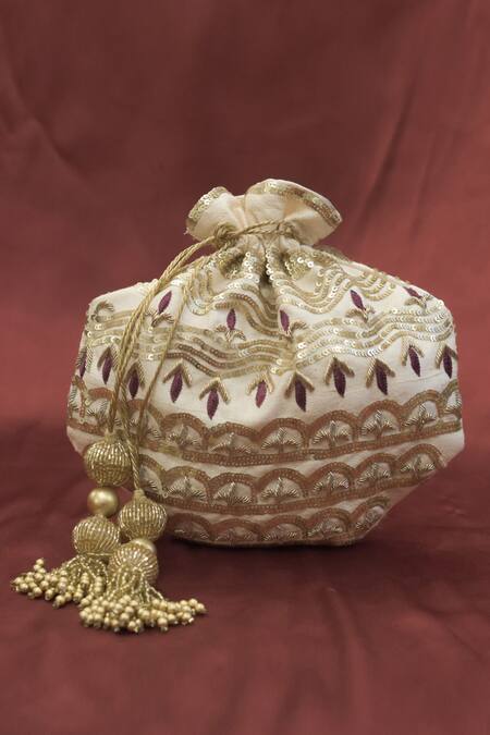 Beige octagonal shaped potli featuring thread, sequin, and leaf embroidery
