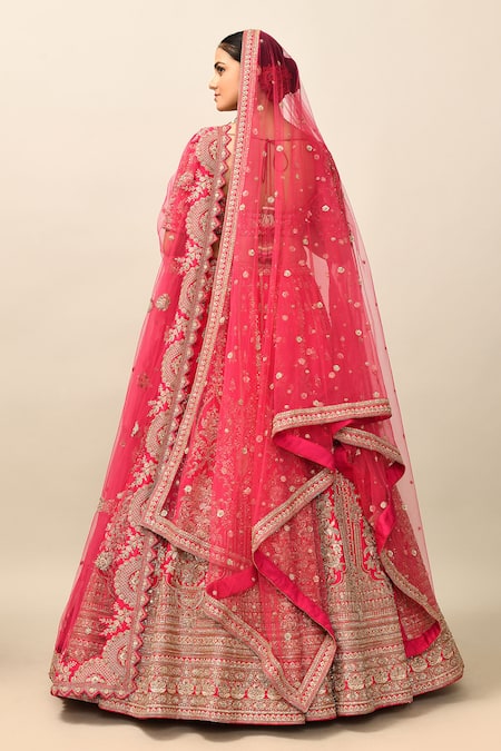 Pink bridal lehenga featuring intricate zari, resham, cutdana, and sequin embroidery in a floral pattern. Paired with a leaf neck embroidered padded blouse and two dupattas with border embroidery.