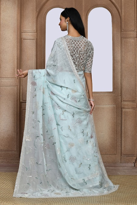 Aqua organza saree featuring embroidered border details with floral patterns. Paired with a running blouse piece, embellished with sequin, beads, and cutdana work.