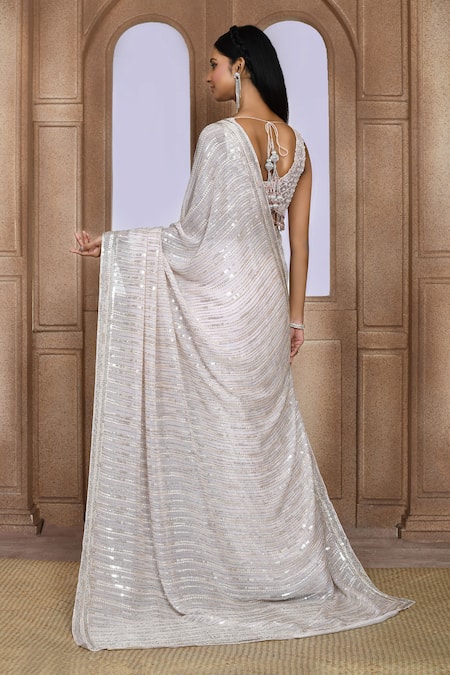 Pink organza saree featuring an all-over stripe pattern with metallic varied sequin and cut dana embroidery
