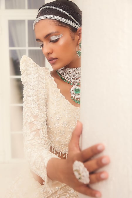 Ivory Net Sequins, Beads, Embroidery, Cut Work Round Neck Emma Lehenga Set