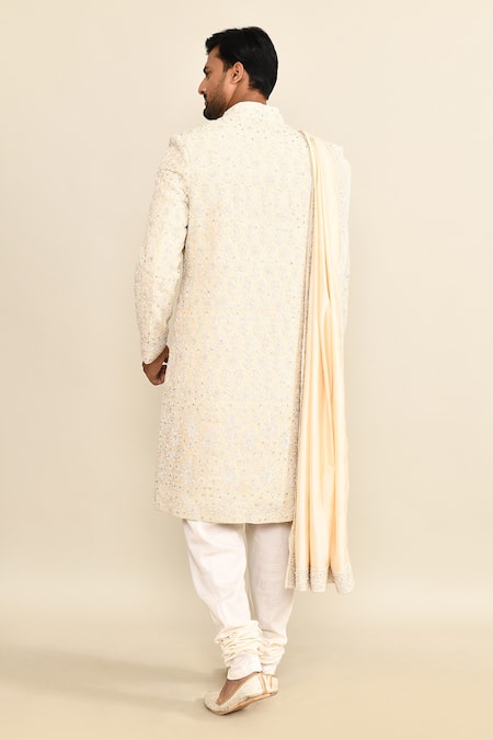 Ivory sherwani featuring all-over floral embroidery with sequins and cutdana. Paired with a churidar and a matching dupatta.