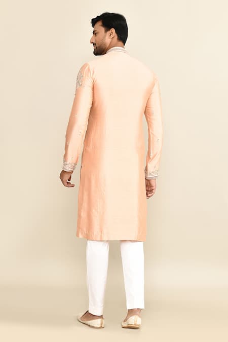 Peach kurta featuring floral embroidery with cutdana and sequins. Paired with ivory pant for a complete look.