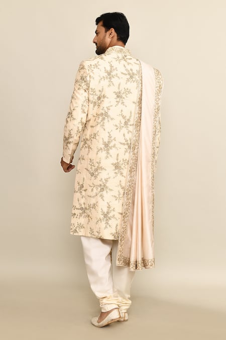 Ivory sherwani featuring all over floral jaal embroidery with sequins and cutdana. Paired with a matching inner kurta, churidar, and a coordinating dupatta.