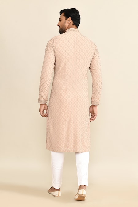 Dusty pink kurta featuring floral and geometric jaal embroidery with sequins and cutdana. Paired with ivory pants for a coordinated look.