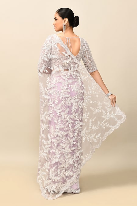 Lilac saree featuring floral cutdana and thread embroidery with a scallop border. Paired with a half sleeve embroidered blouse with a back hook & eye closure and tassel tie-up.