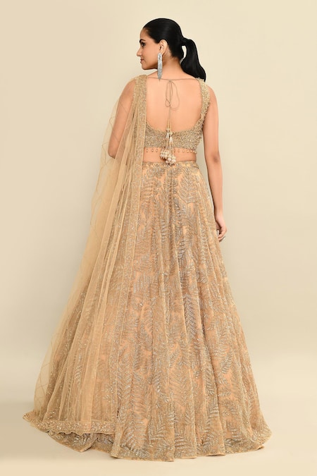 Gold lehenga featuring hand embroidered leaf pattern with sequin and cutdana work. Paired with a matching tasseled blouse and dupatta.