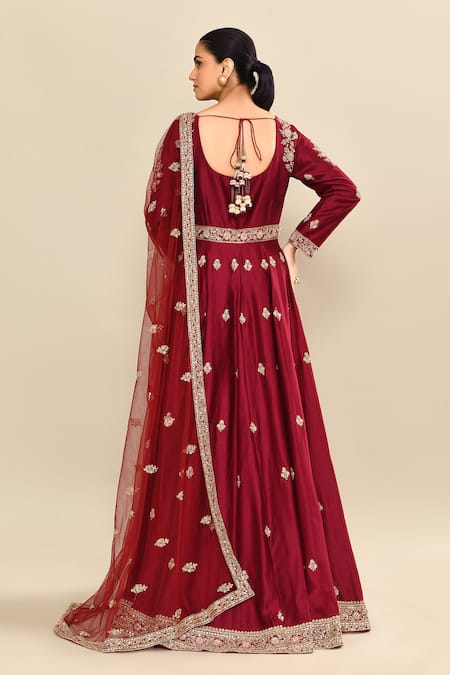 Maroon anarkali featuring full sleeves and a paan neck with intricate floral hand embroidery using sequins and cutdana. The set includes a sheer embroidered dupatta for an elegant finish.