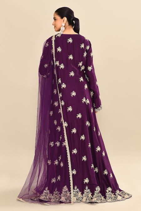 Purple anarkali gown featuring all-over floral and rosette embroidery with sequins and cutdana. Paired with a coordinating dupatta that enhances the overall elegance.